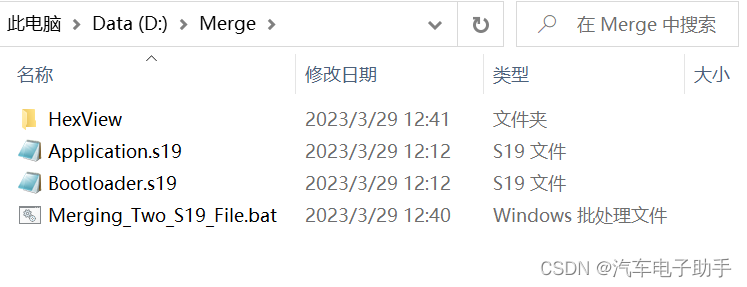 基于批处理Bat(如下图中的Merging_Two_S19_File.bat)调用HexView工具提供的Command line,通过该脚本来实现两个S19文件(Bootloader.s19和Application.s19)的合并。将该该脚本集成开发环境IDE(CodeWarrior,S32K DS,Davinci,EB Tresos,ETAS…)中,即可自动实现S19文件的合并。见图2-2。