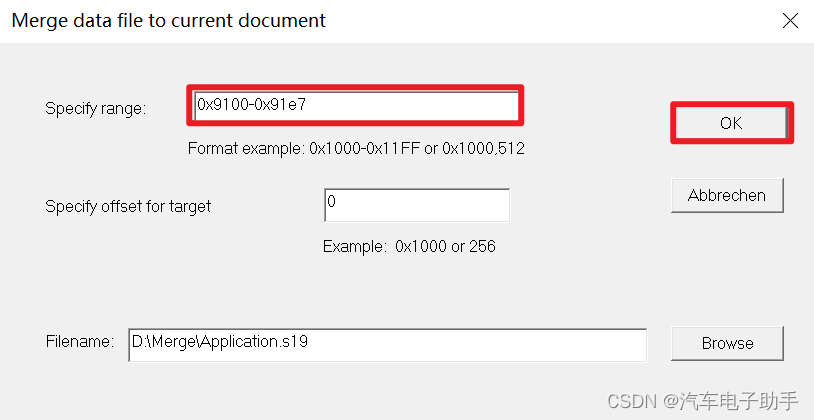 紧接着在弹出的Merge data file to current document对话框中,选择Application.s19文件中需要合并的地址范围(如果你是所有的地址范围都合并,通常默认,无需改动),接着单击Ok,见图2-7。