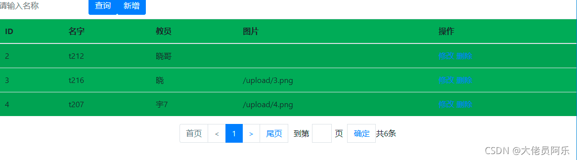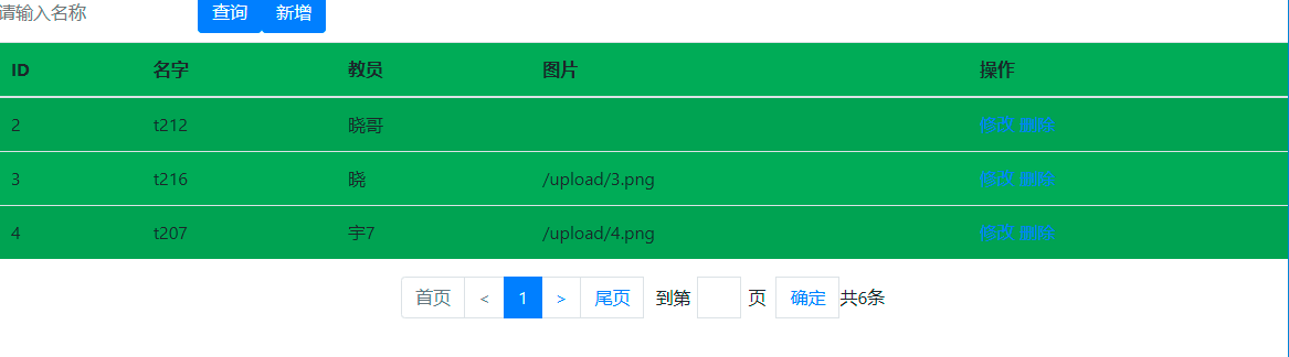 ID 名字 教员 图片 操作 ${b.cid } ${b.cname} ${b.cteacher } ${b.pic } 修改删除