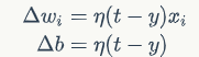 其中,t是训练样本的实际值,一般称之为label。而y是感知器的输出值,它是根据公式(1)计算得出。η是学习速率,作用是控制每一步调整权的幅度。