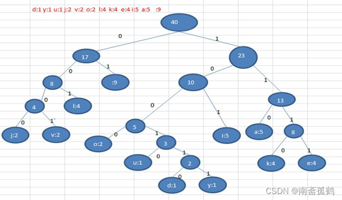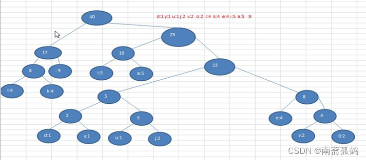 首先我们对传输的 字符串( i like like like java do you like a java)进行各个字符出现的次数统计;得到结果—— d:1 y:1 u:1 j:2 v:2 o:2 l:4 k:4 e:4 i:5 a:5 :9(空格)