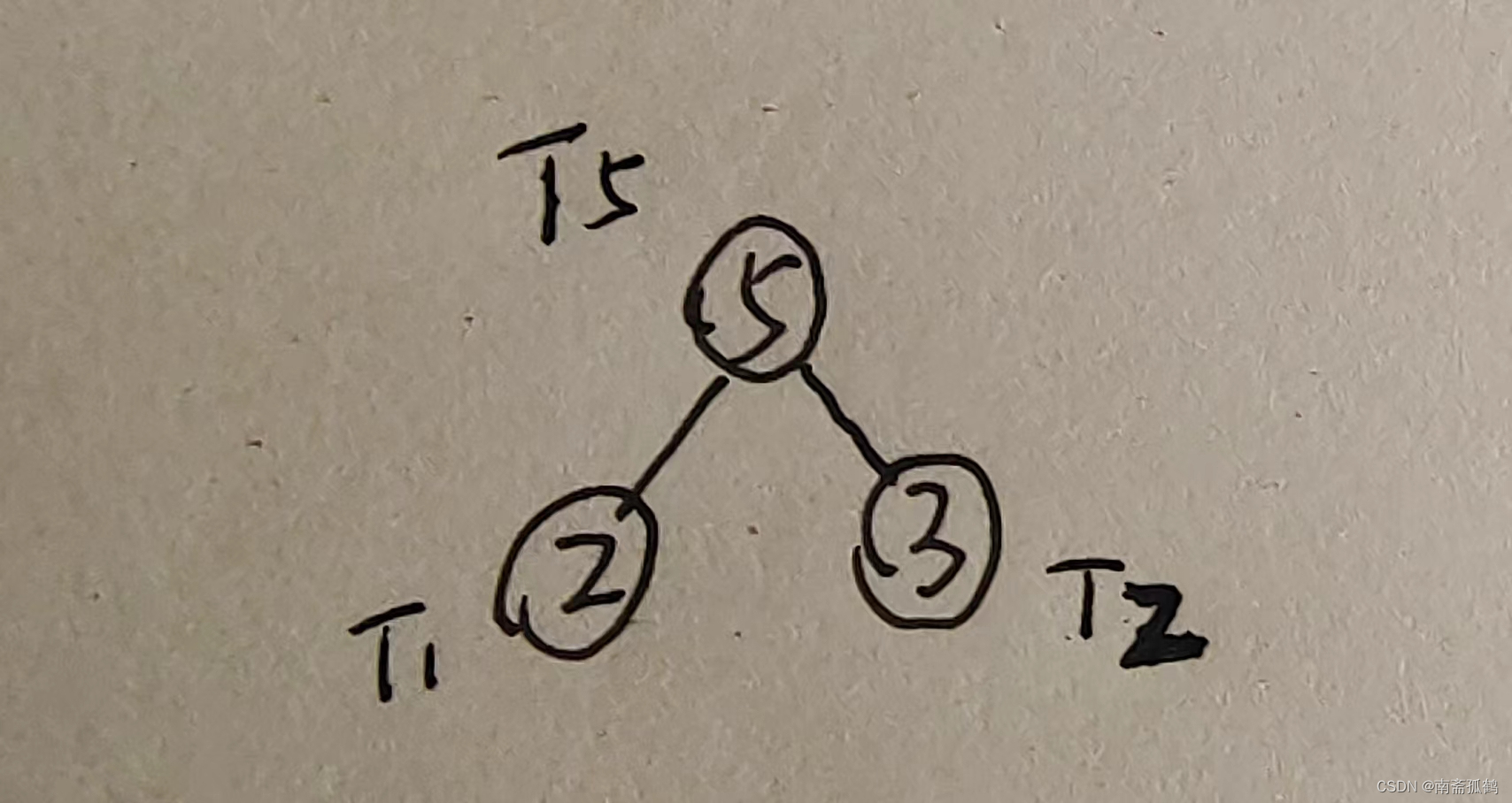 从集合T中选择权值最小的两个节点,即2和3。使用权值最小的两个节点作为左右子树(图中的T1和T2),构造新的树T5,新的树的权值为左右子树权值之和: