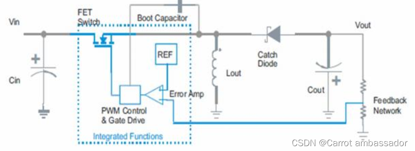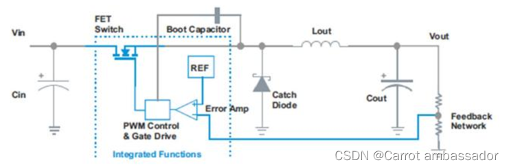 简单总结即是,控制器需要外加开关管,稳压器已经将开关管集成到IC内部,如下图所示。
