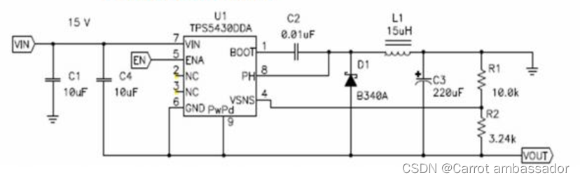 下图是用 TPS5430DA 实现的一个负电压输出的电路, TPS5430DA 和 LM22670 的引脚相同,两者可以互换。