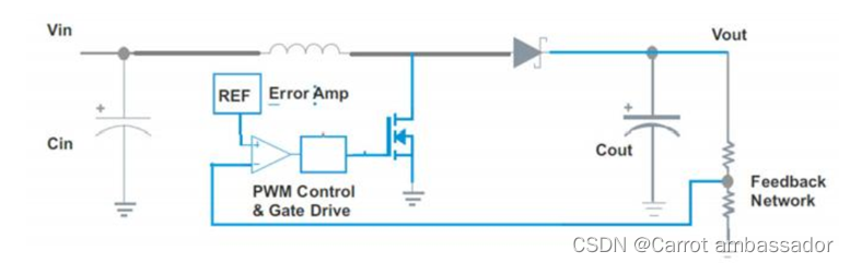 如下图是一个电路结构,我们可以通过两个电阻的分压采样输出的电压,再经过一个比较器和基准比较,如果输出小于基准, MOS 管就开通;如果输出大于基准,就关断 MOS管。