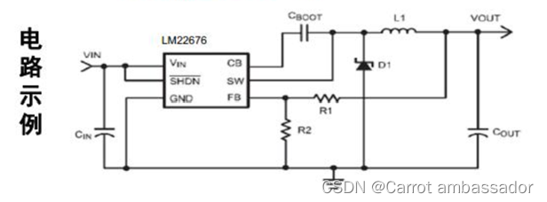 如下图是用 LM22670 芯片做的电路示例,这就是一个典型的非同步降压转换器,因为他下管是用了一个快恢复或者肖特基二极管。为什么要用肖特基呢?因二极管的寄生参数和漏感会导致在 MOS 管在开通时产生一个高压的震荡,这个震荡最终会导致芯片的 SW 引脚高压损坏和开关损耗非常大,导致效率很低,所以一般会使用快恢复或者肖特基二极管。