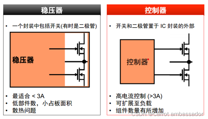 控制器(Controler)和稳压器(Regularlator),下图是一个控制器和稳压器的区分参考,集成开关管的 IC 我们一般称之为稳压器,需要外置开关管的 IC 我们称之为控制器,而图中的描述我们只能作为一个参考,现在很多的稳压器已经可以做到大于 3A,而且热阻低到 10℃/W 也有很多,但很多大功率的开关电源还是需要控制器,外置 MOS 管。