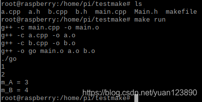 以上是本次测试的全部程序。他们的关系是:主程序运行首先需要找到a.h和b.h,这里涉及到linux系统头文件搜寻机制,现在只要在同级目录下就可以找到,进入main函数,实例化a并运行print函数和实例化b并运行print函数,所以他们要找到a.cpp和b.cpp,这里就涉及到文件链接,Windows下是工程自动链接,linux需要自己手动链接,所以这时候就需要makefile文件。