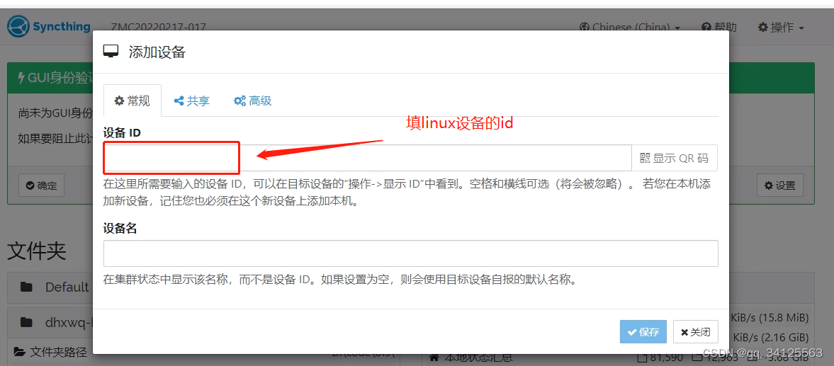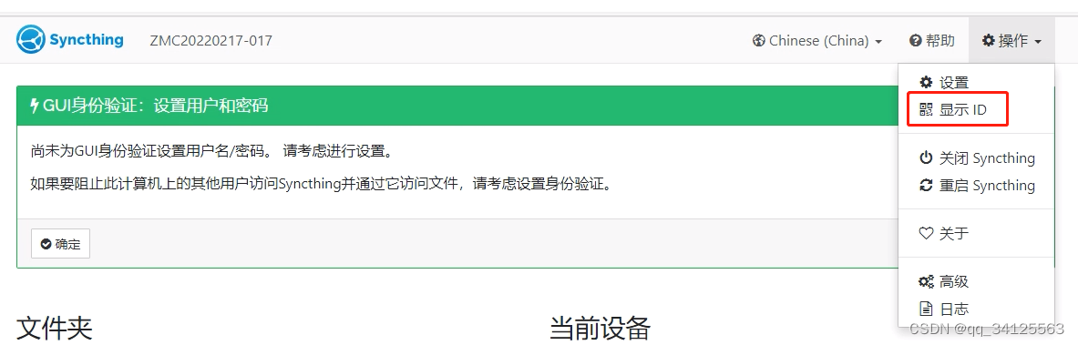 在启动了linux和windows的syncthing后,会有两个web窗口弹出,如图,在每个web界面,可以查询对应的设备id(这个id后面会用到),如图查询的windows对应的syncthing识别的设备id