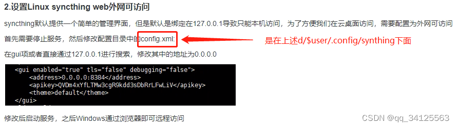 在linux的syncthing目录下直接执行syncthing文件: ./syncthing (不用在意输出的错误提示),会生成/$user/.config/synthing/目录。这里的/$user/值用户所能访问的根目录。