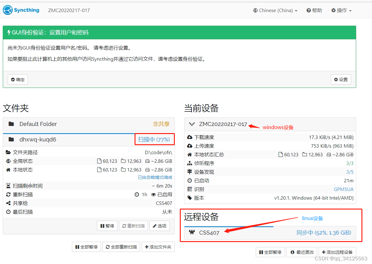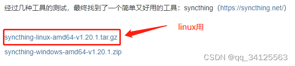 图中syncthing包分别传入linux和windows设备任意目录,并解压;