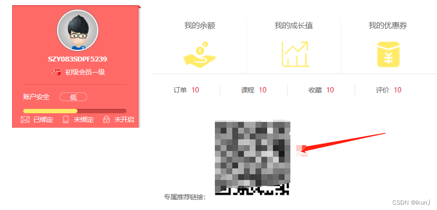 /*** 获取用户的推荐码并生成推荐码*/@Overridepublic String getRecommendCode(Long id) {User user = iUserService.selectById(id);String urlCode = "http://localhost:6003/reg.phone.html?code="+ user.getCode(); //拼接urlBufferedImage QRCode = null; //生成二维码try {QRCode = QRCodeUtil.getBufferedImage(urlCode);String base64Image = BufferedImageToBase64.convertBufferedImageToBase64(QRCode);return base64Image;} catch (Exception e) {e.printStackTrace();throw new GlobleException("系统异常,请稍后别试");}}