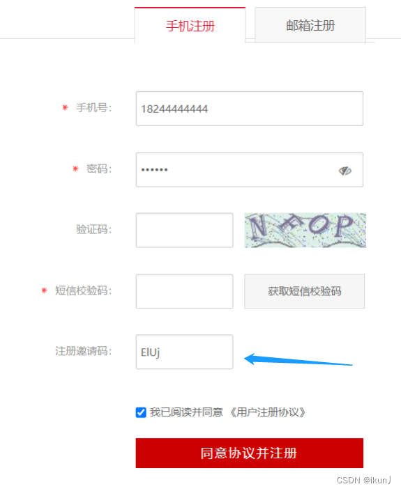 2.其他注册用户如果是通过扫描这个二维码会跳转到注册界面,注册页面会将路径中的推荐码放入推荐码文本框