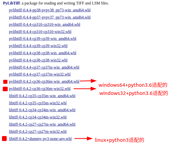 第一步: 下载windows版的libtiff安装文件。下载地址:https://www.lfd.uci.edu/~gohlke/pythonlibs/#pylibtiff,下载项名称为:pylibtiff-0.4.2-cp36-cp36m-win_amd64.whl