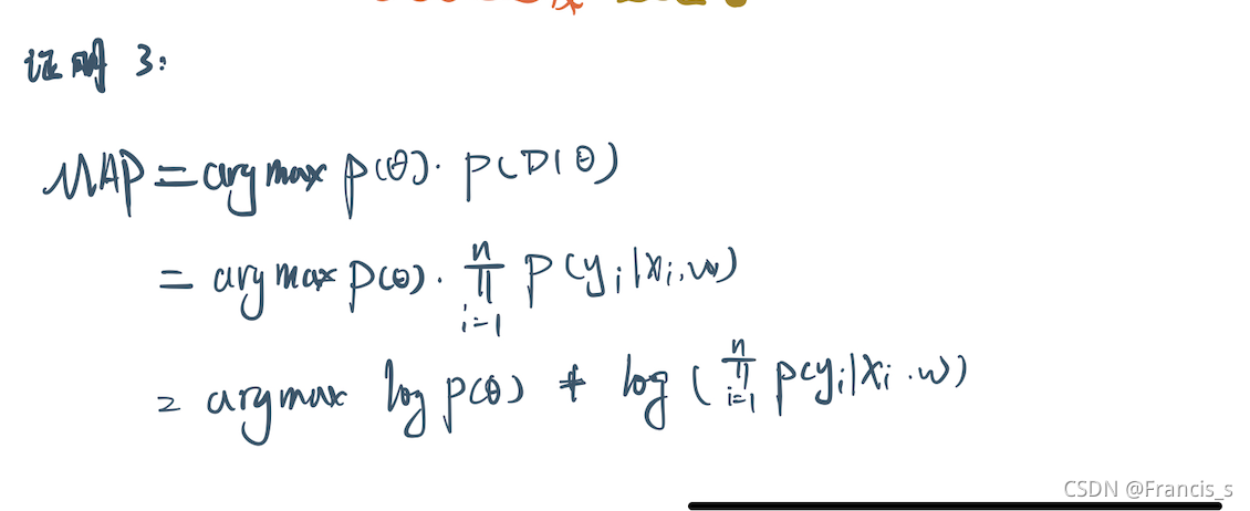 MAP: 怎么理解这个D在后面呢?因为我们是基于数据去对参数进行估计的,我们假设有一个预估的先验概率,然后根据观测数据,不断调整之前的预估,也就是让这个参数尽可能地接近实际情况,所以在这里