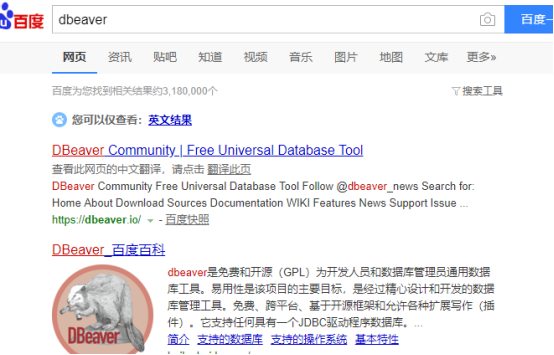 2.1、打开百度搜索页面,搜索dbeaver,然后去DBeaver官方网站下载,如下图所示。