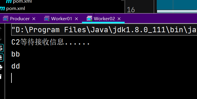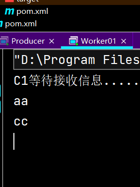 4.启动两个消费者,消费者work01接收到的为