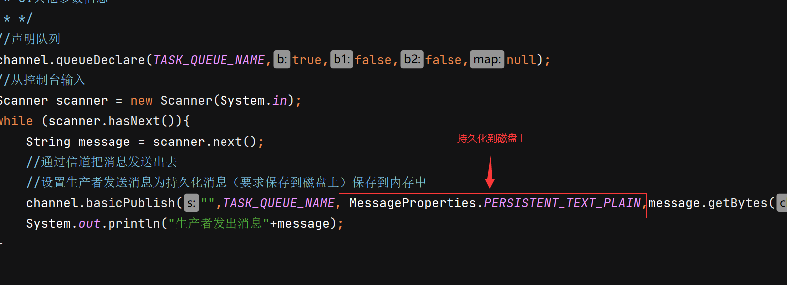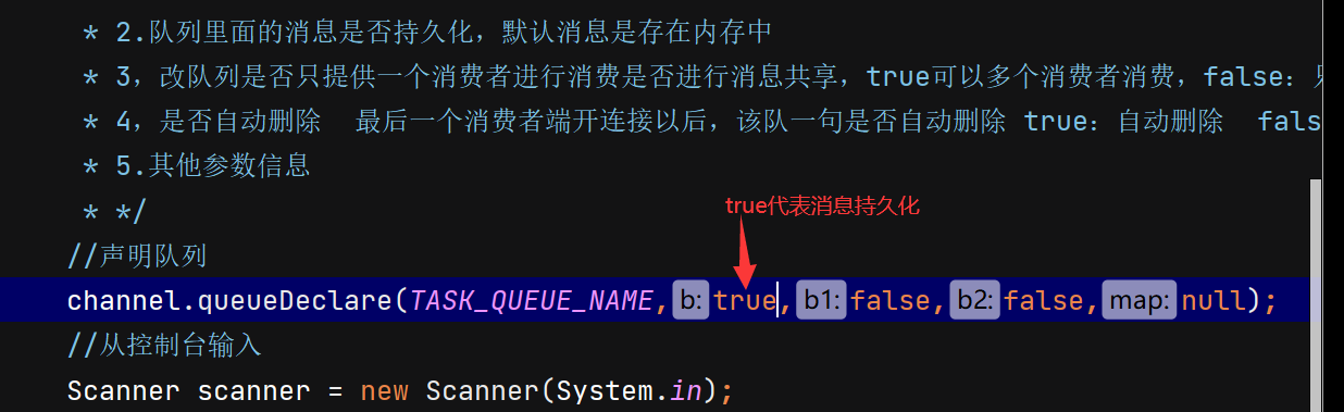 public class Producer {//队列名称public static final String QUEUE_NAME="hello";public static void main(String[] args) throws Exception {Channel channel = RabbitMqUtils.getchanel();/** 生成一个队列* 1.队列名称* 2.队列里面的消息是否持久化,默认消息是存在内存中* 3,改队列是否只提供一个消费者进行消费是否进行消息共享,true可以多个消费者消费,false:只能一个消费这个消费* 4,是否自动删除 最后一个消费者端开连接以后,该队一句是否自动删除 true:自动删除 false不自动删除* 5.其他参数信息* */channel.queueDeclare(QUEUE_NAME,false,false,false,null);//从控制台当中接收消息Scanner scanner = new Scanner(System.in);while (scanner.hasNext()){String message = scanner.next();channel.basicPublish("",QUEUE_NAME,null,message.getBytes());}/** 发送一个消费* 1.发送到哪个交换机* 2.路由的key值是哪个,本次是队列的名称* 3.其他的参数信息* */System.out.println("消息发送完毕");}