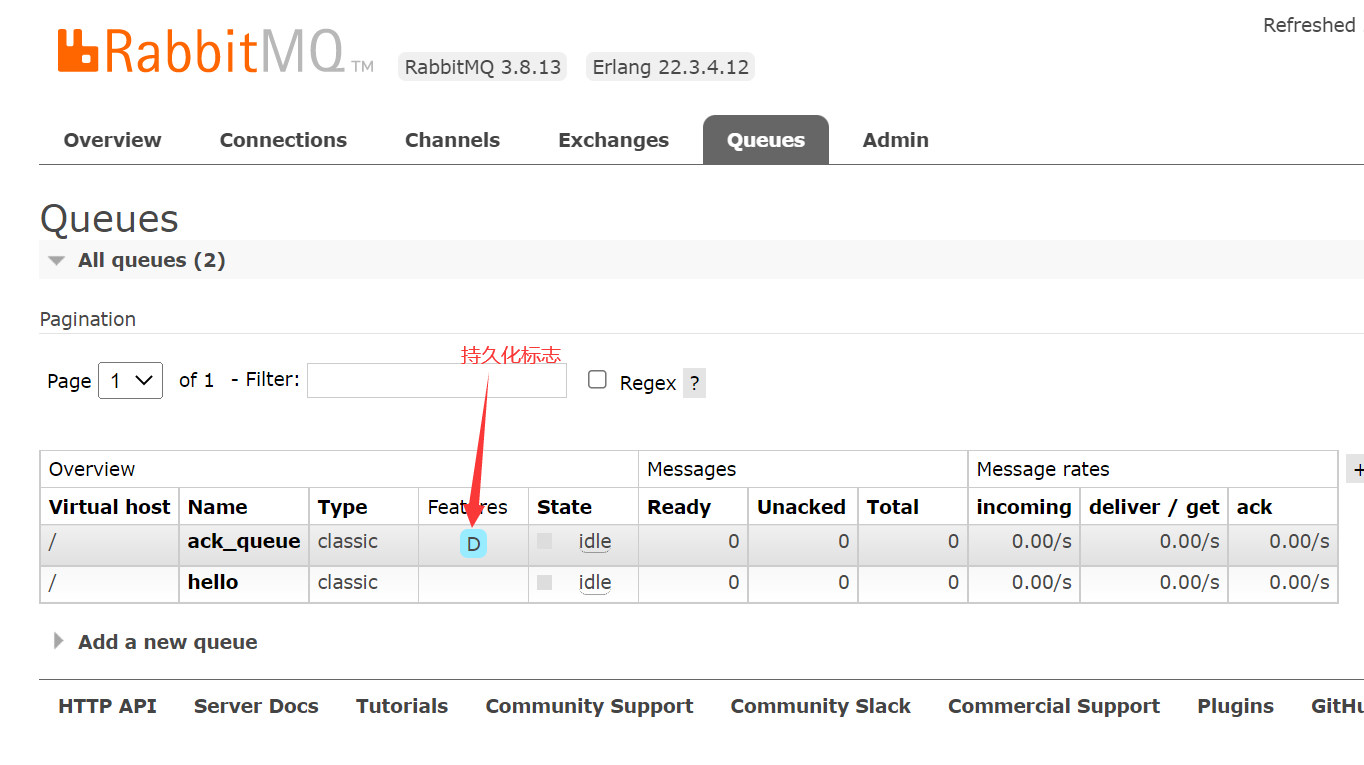 之前我们创建的队列都是非持久化的,rabbitmq如果重启的化,该队列就会被删除掉,如果要队列实现持久化需要在声明队列的时候把durable参数设置为持久化