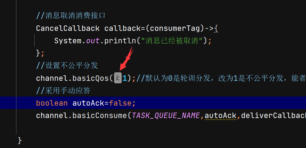 //设置不公平分发channel.basicQos(1);//默认为0是轮训分发,改为1是不公平分发,能者多劳