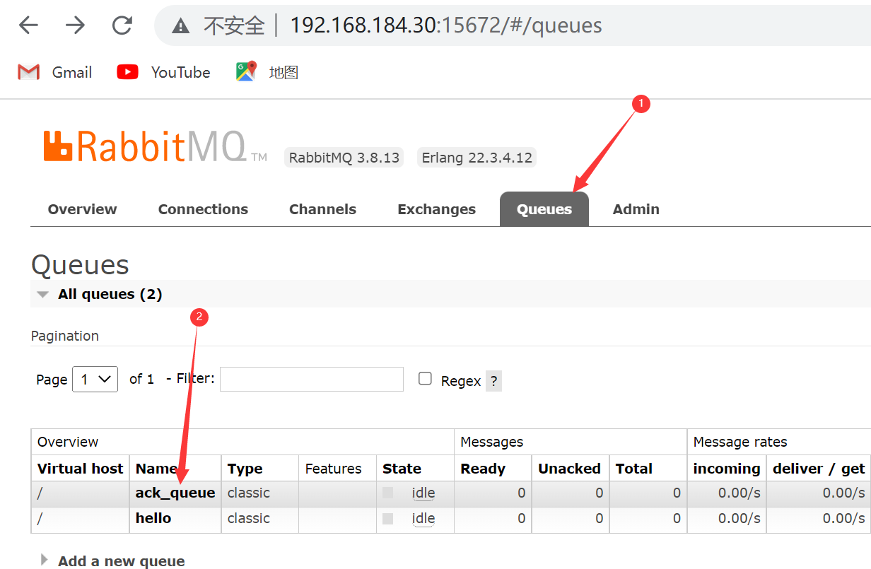 public class Consumer {//队列名称public static final String QUEUE_NAME="hello";//创建一个连接工厂public static void main(String[] args) throws IOException, TimeoutException {ConnectionFactory factory = new ConnectionFactory();//工厂IP,连接Rabbitmq的队列factory.setHost("192.168.184.30");//用户名和密码factory.setUsername("admin");factory.setPassword("admin");//创建连接Connection connection = factory.newConnection();//获取信道Channel channel = connection.createChannel();//声明接收消息DeliverCallback deliverCallback=(consumerTag,message)->{System.out.println(new String(message.getBody()));};//声明取消消息CancelCallback callback=mess->{System.out.println("消息被中断");};/** 消费者消费消息* 1.消费哪个队列* 2.消费者成功之后是否要应答 true代表自动应答,false代表树洞应答* 3.消费者未成功消费的回调* 4.消费者取消消费的回调** */channel.basicConsume(QUEUE_NAME,true,deliverCallback,callback);}