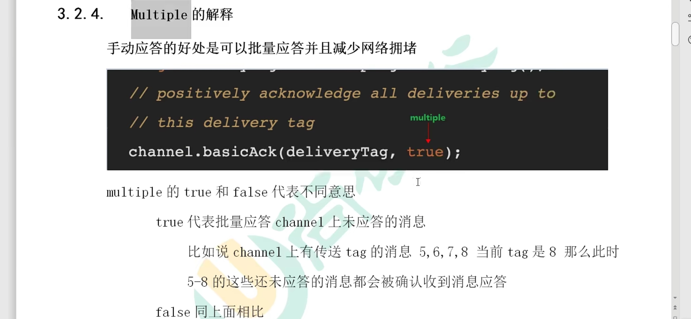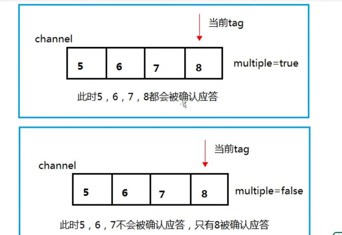 true代表批量应答channel上未应答的消息比如说channel上有传送 tag的消息 5,6,7,8 当前 tag是8那么此时5-8的这些还未应答的消息都会被确认收到消息应答