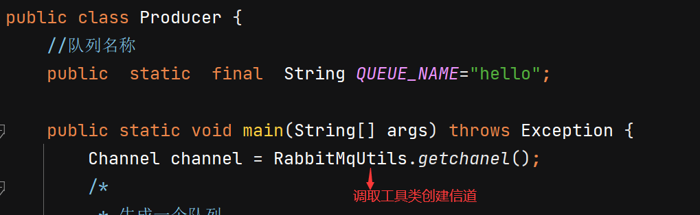 public class RabbitMqUtils {//创建一个连接工厂public static Channel getchanel() throws Exception {ConnectionFactory factory = new ConnectionFactory();//工厂IP,连接Rabbitmq的队列factory.setHost("192.168.184.30");//用户名和密码factory.setUsername("admin");factory.setPassword("admin");//创建连接Connection connection = factory.newConnection();//获取信道Channel channel = connection.createChannel();return channel;