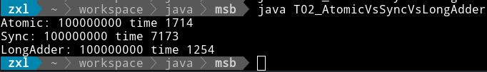 import java.util.concurrent.atomic.LongAdder;public class T02_AtomicVsSyncVsLongAdder {static long count2 = 0L;static AtomicLong count1 = new AtomicLong(0L);static LongAdder count3 = new LongAdder();public static void main(String[] args) throws Exception {Thread[] threads = new Thread[1000];for(int i=0; i {for(int k=0; k<100000; k++) count1.incrementAndGet();});}long start = System.currentTimeMillis();for(Thread t : threads ) t.start();for (Thread t : threads) t.join();long end = System.currentTimeMillis();//TimeUnit.SECONDS.sleep(10);System.out.println("Atomic: " + count1.get() + " time " + (end-start));//-----------------------------------------------------------Object lock = new Object();for(int i=0; i {for(int k=0; k<100000; k++) count3.increment();});}start = System.currentTimeMillis();for(Thread t : threads ) t.start();for (Thread t : threads) t.join();end = System.currentTimeMillis();//TimeUnit.SECONDS.sleep(10);System.out.println("LongAdder: " + count1.longValue() + " time " + (end-start));}static void microSleep(int m) {try {TimeUnit.MICROSECONDS.sleep(m);} catch (InterruptedException e) {e.printStackTrace();}}}