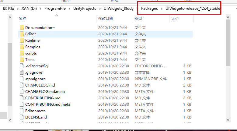 2、将下载的UIWidgets包文件夹移动到Unity项目的Package文件夹中