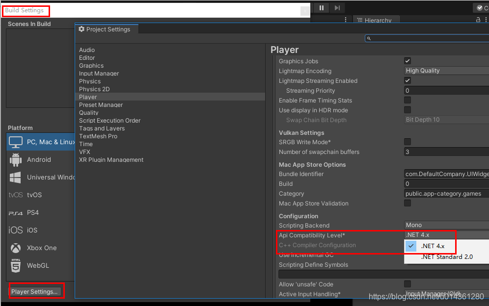 4、回到Unity界面,在 File - Build Settings 中,建议把 Player Settings --- Api Compatibility Level 设置为 Net 4.x