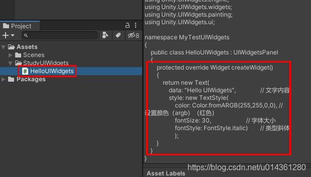 {public class HelloUIWidgets : UIWidgetsPanel{protected override Widget createWidget(){return new Text(data: "Hello UIWidgets", // 文字内容style: new TextStyle(color: Color.fromARGB(255,255,0,0), // 设置颜色(argb)(红色)fontSize: 30, // 字体大小fontStyle: FontStyle.italic) // 类型斜体);}}