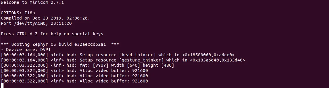 下载完成之后,按下 REST 重启开发板。此时可以使用 minicom 连接开发板的串口,查看日志: