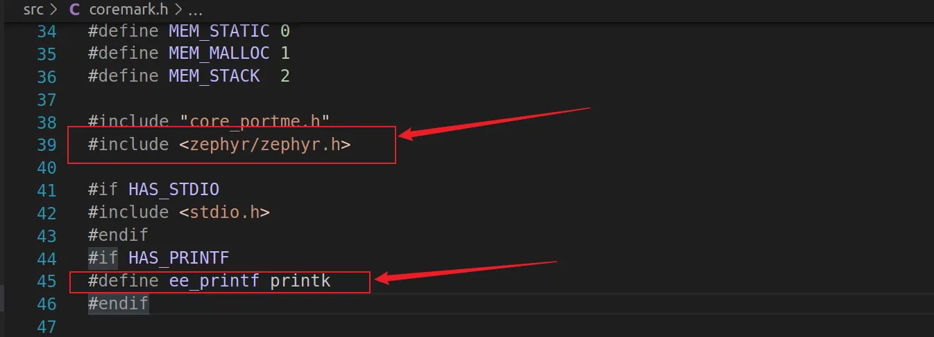 # # nothing here CONFIG_PRINTK=y CONFIG_DEBUG=y CONFIG_LOG=y CONFIG_MAIN_STACK_SIZE=8192 CONFIG_GPIO=y CONFIG_FPU=y CONFIG_NEWLIB_LIBC=y - 修改 core_portme.c 文件
