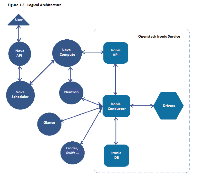 目前,在OpenStack体系结构中,Ironic还是通过Nova来调用的,模拟Nova的一个虚拟化驱动(其它的虚拟化驱动还有KVM、VMware、Xen等),实现基于Ironic的虚拟化驱动。