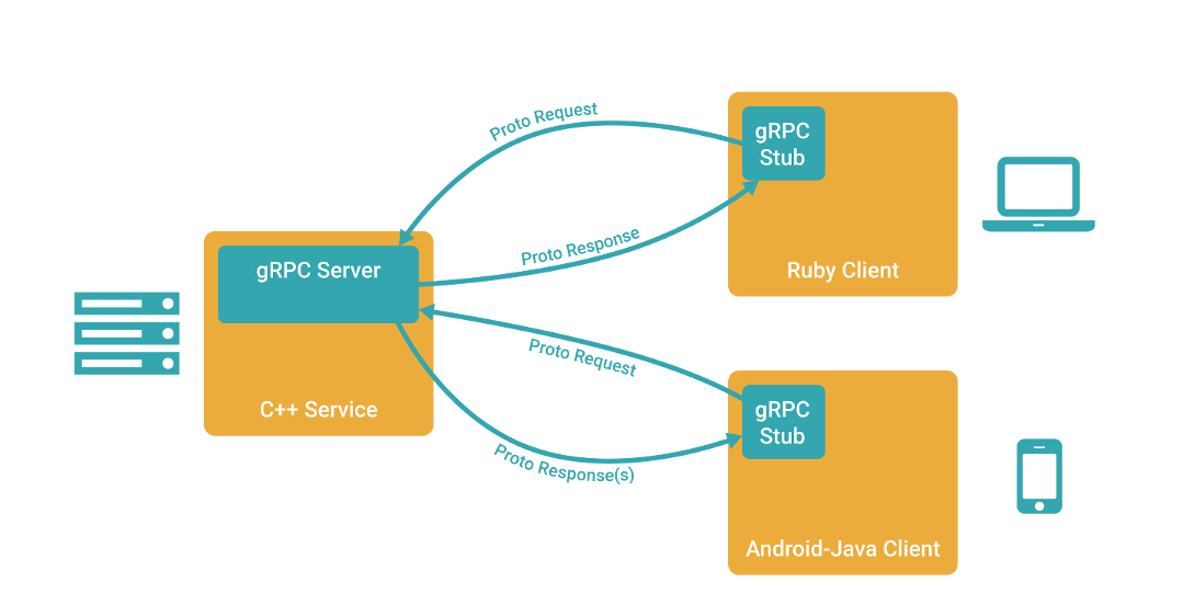 上图中的 Protocbuf 是gRPC的数据序列化工具,使用 Protobuf 将数据序列化成二进制的数据流,即可让用不同语言(proto3支持C++, Java, Python, Go, Ruby, Objective-C, C#)编写并在不同平台上运行的应用程序交换数据。ps:Protocbuf 也是 Google 开源的。