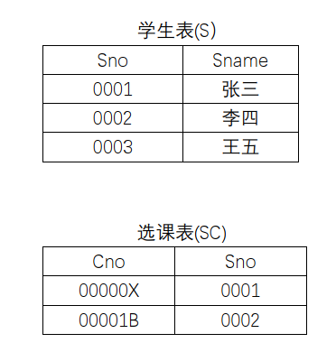 其中学生表有两个属性学号(Sno)、姓名(Sname),选课表有两个属性课程号(Cno)、学号(Sno).