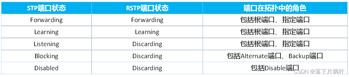 RSTP的状态规范缩减成为了3种,根据端口是否转发用户流量和学习MAC地址来划分:
