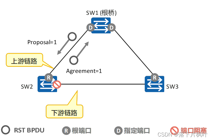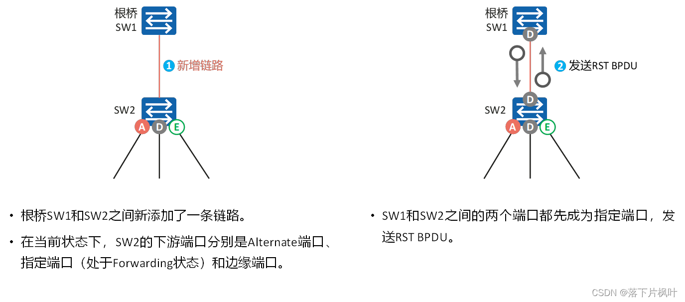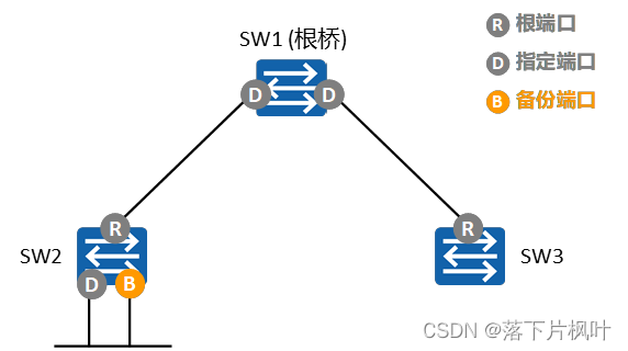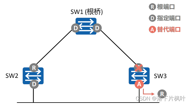 - SW2收到更优的RST BPDU后,经过比较认为SW1才是当前根桥,此时SW2的端口将成为根端口,而不是指定端口,停止发送RST BPDU。