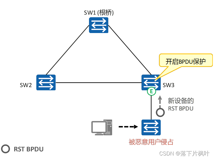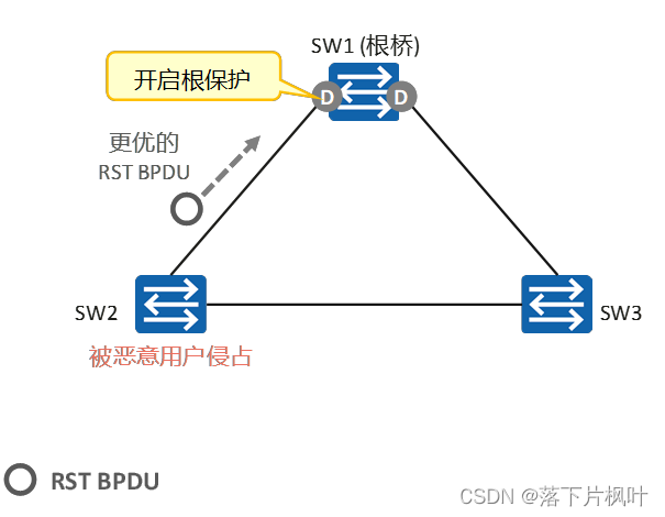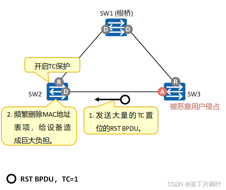 - 如果SW3被恶意用户侵占,伪造大量TC置位的RST BPDU并向外发送。SW2收到这些RST BPDU后,会频繁执行MAC地址表项的删除操作,形成巨大负担。