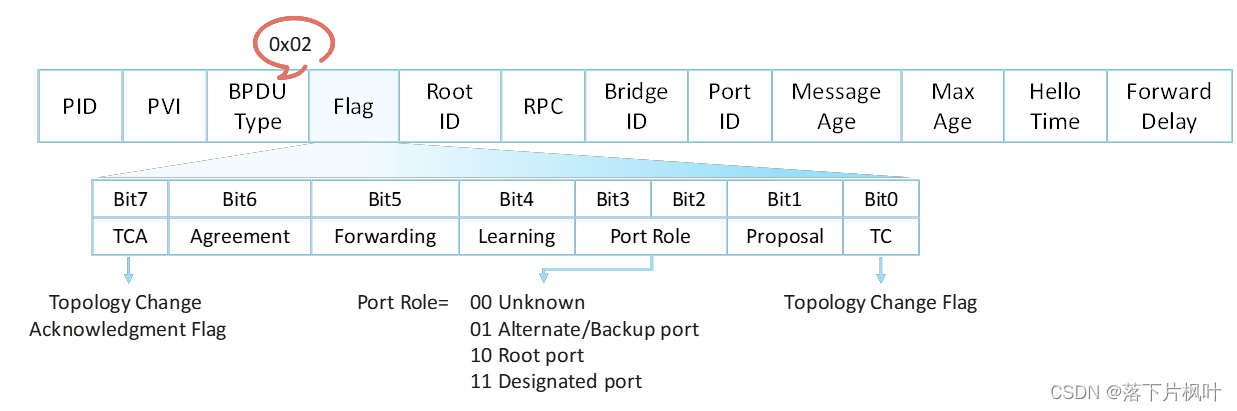 - BPDU Type字段:配置BPDU类型不再是0而是2(0x02),所以运行STP的设备收到RSTP的配置BPDU时会丢弃。