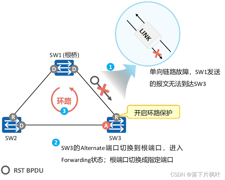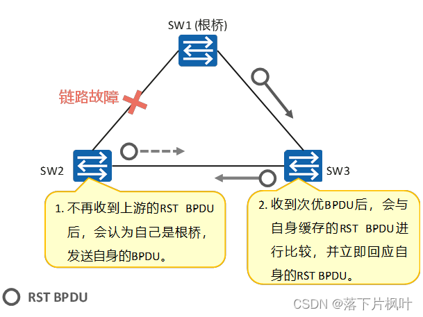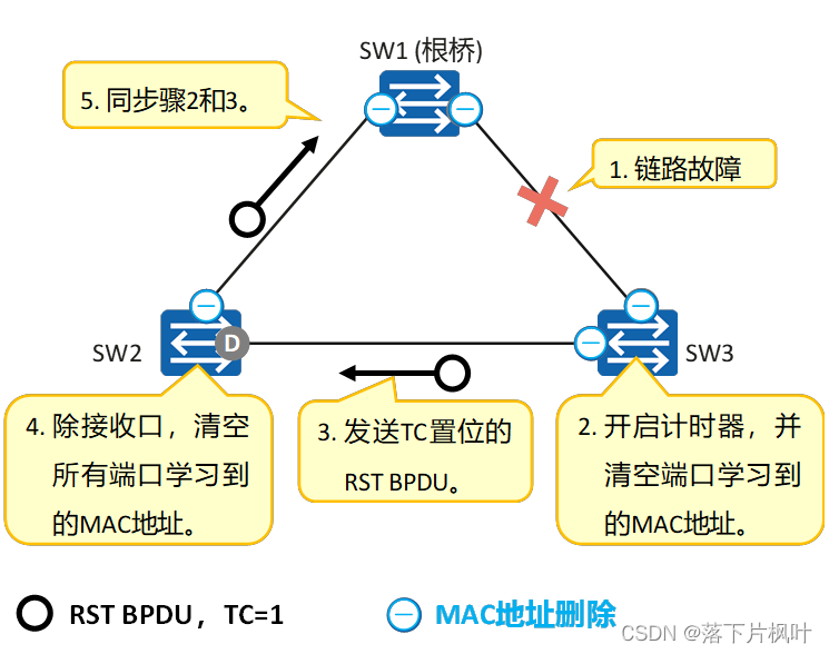 - 在RSTP中,通过新的拓扑变更机制,TC置位的RST BPDU会快速的在网络中泛洪。