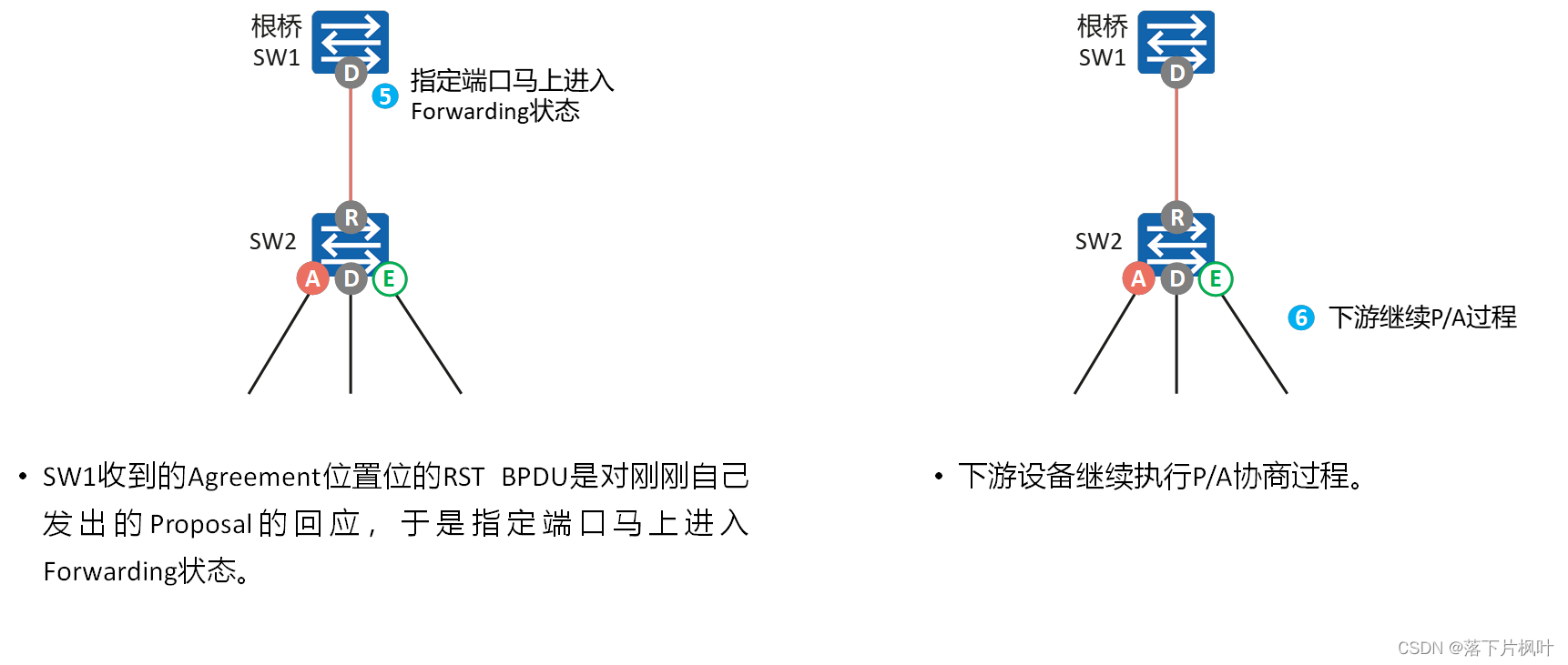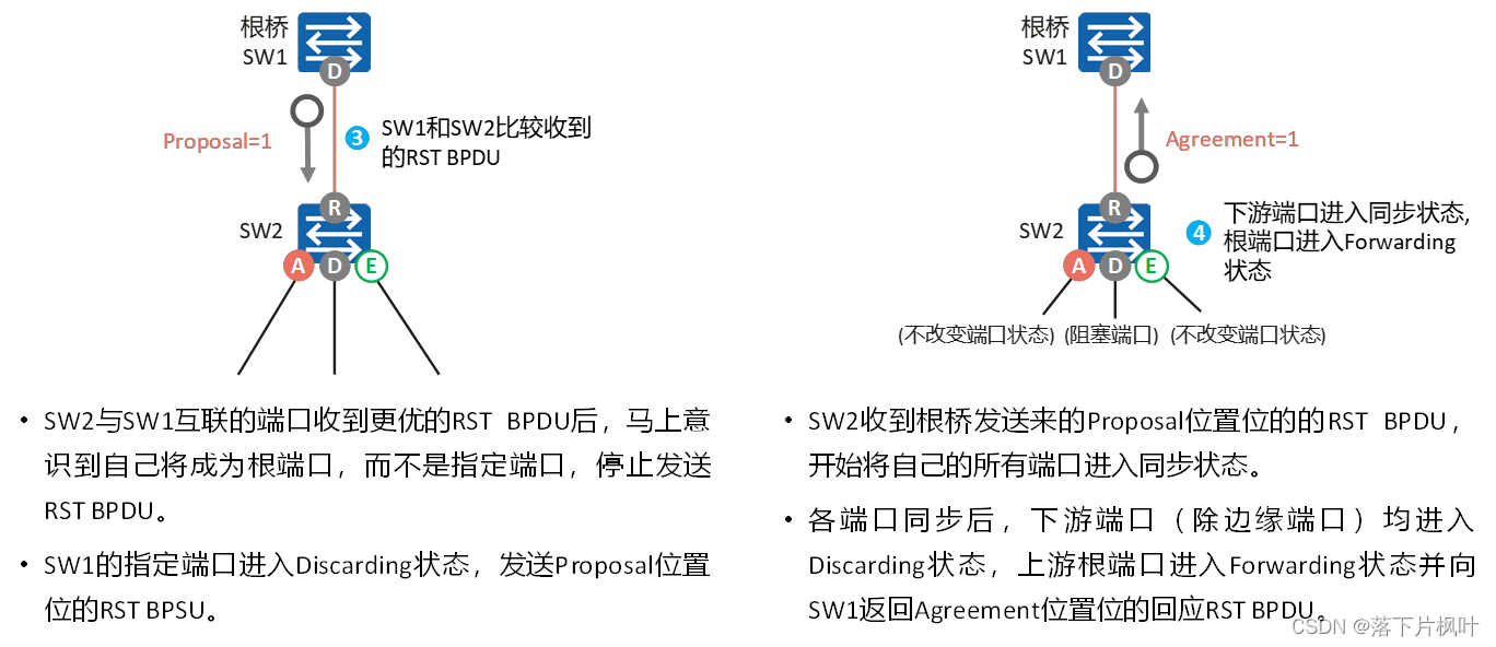 - 在RSTP中,当一个端口被选举成为指定端口之后,会先进入Discarding状态,再通过P/A机制快速进入Forwarding状态。