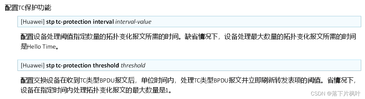 - 交换设备在接收到TC置位的RST BPDU报文后,会执行MAC地址表项的删除操作。如果有人伪造TC置位的RST BPDU报文恶意攻击交换设备时,交换设备短时间内会收到很多RST BPDU报文,频繁的删除操作会给设备造成很大的负担,给网络的稳定带来很大隐患。