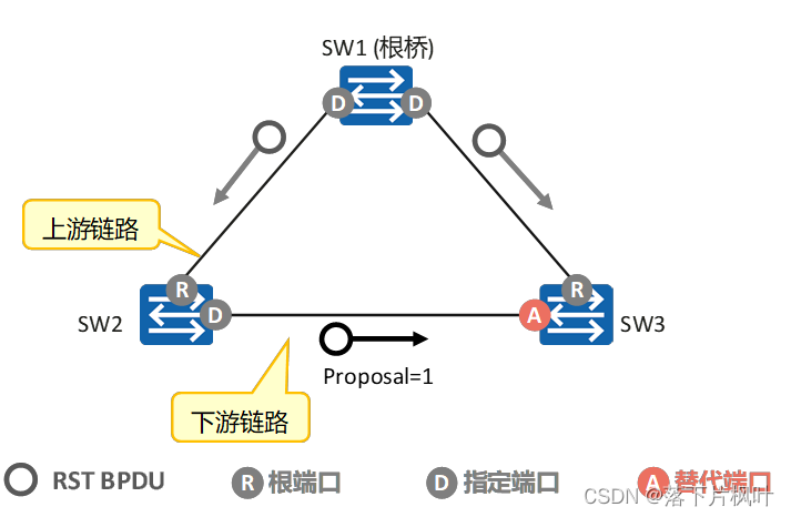 - SW3的下游端口收到该RST BPDU后,发现不是设备收到最优的BPDU,则会忽略,不会发送A位置位的RST BPDU。