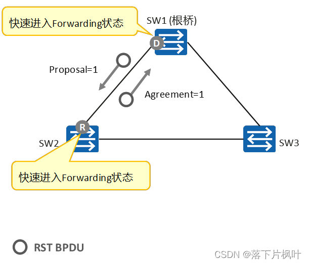 - SW2的各端口同步后,根端口立即进入Forwarding状态,并向SW1返回A位置位的RST BPDU。SW1收到该报文后,会让指定端口立即从Discarding状态进入Forwarding状态。