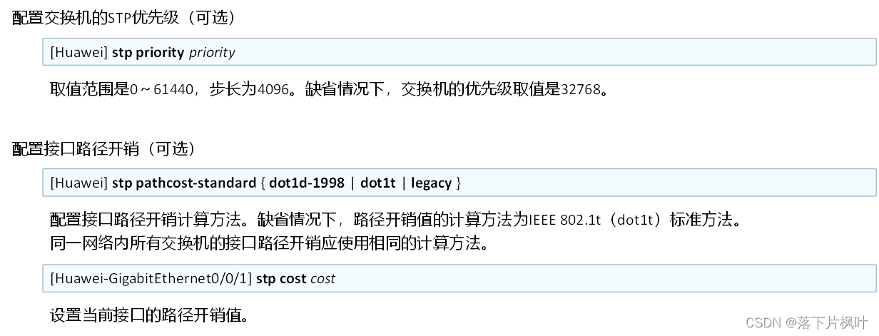 - dot1t:指定路径开销值的计算方法是IEEE 802.1t标准方法。使用IEEE 802.1t标准方法时取值范围是1~200,000,000。