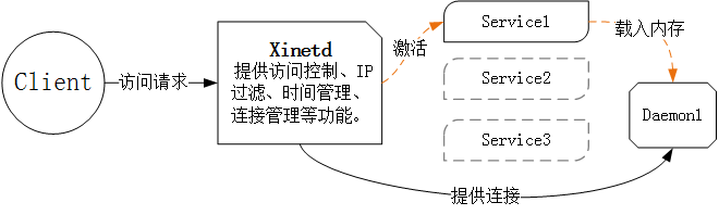 super daemon通过超级守护进程—xinetd来控制服务。系统服务托管在xinetd进程下,当有请求访问端口时,xinetd会启动该服务处理访问请求。同时xinetd还提供监控、访问控制等安全特性,缺点是响应速度较慢。