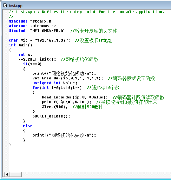 以上便是板卡内编码器相关的两个函数介绍,下面我们来实际运用一下这两个函数,我这里已经写好了一份简单的例程供大家参考,如图:
