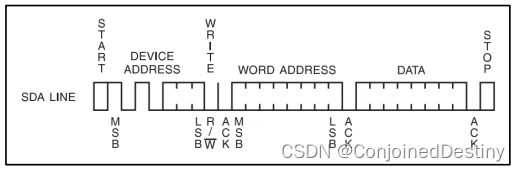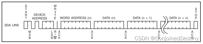 (3) 地址写入完成,主机接收到从机回传的应答信号后,开始单字节数据的写入;数据写入完成,主机接收到应答信号后,开始下一个单字节数据的写入;数据写入完成,主机接收到应答信号。