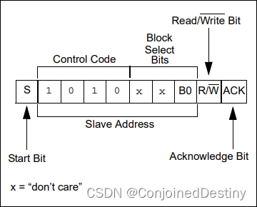 I2C 协议中通过设备地址来寻址以及控制读写,控制字节是主机发送起始信号后被收到的第一个字节。控制字节由一个4 bit 控制位和3 bit的Block Select位以及1 bit 读写控制位组成,其中4 bit 控制位和和3 bit的Block Select位组成从机地址。Read/Write Bit位为 1 时表示Read,Read/Write Bit位为 0 时表示Write。从机成功接收该控制字节后会发送ACK信号至主机。